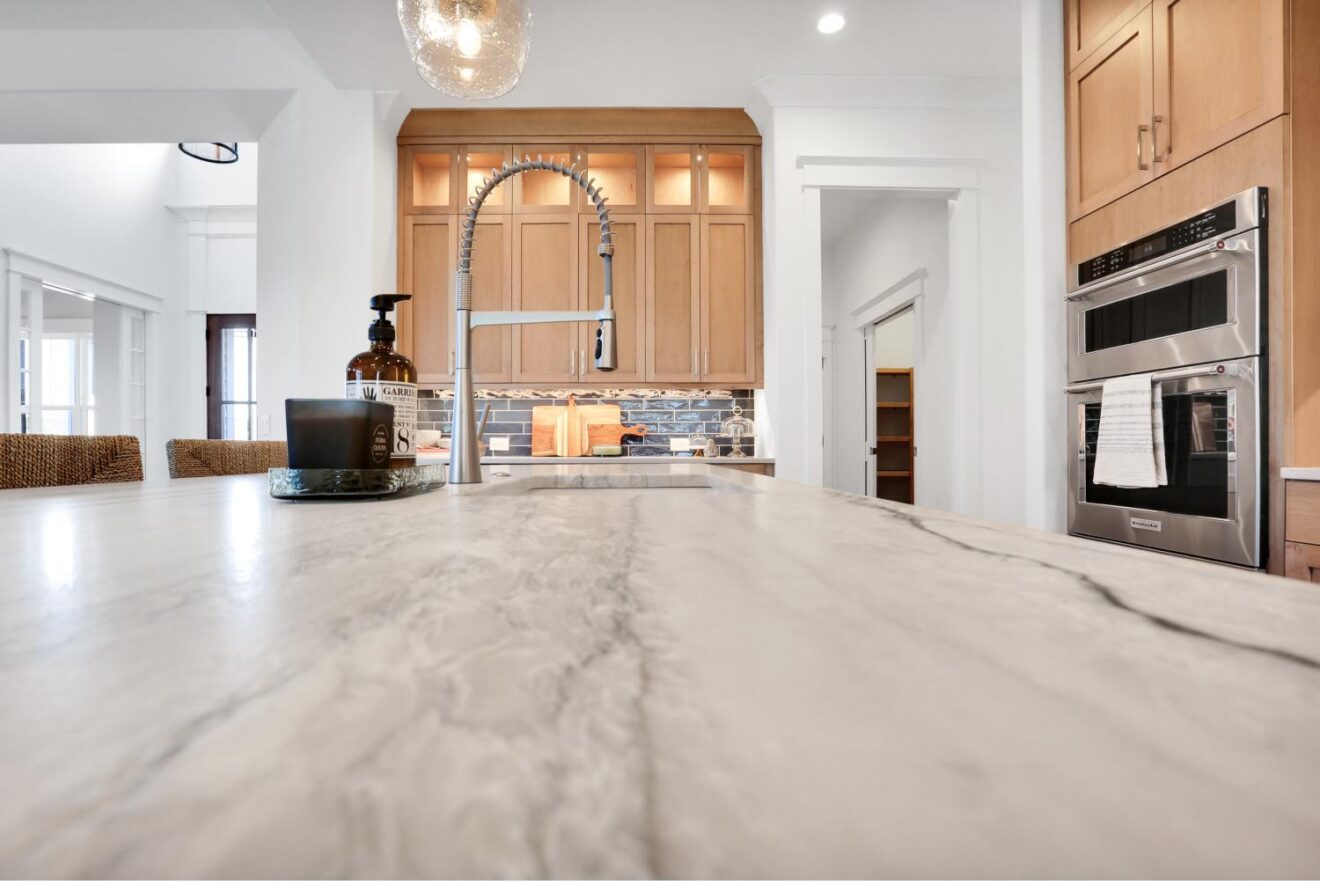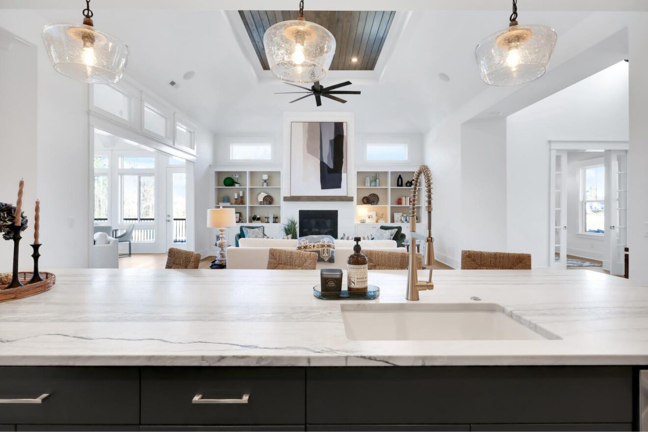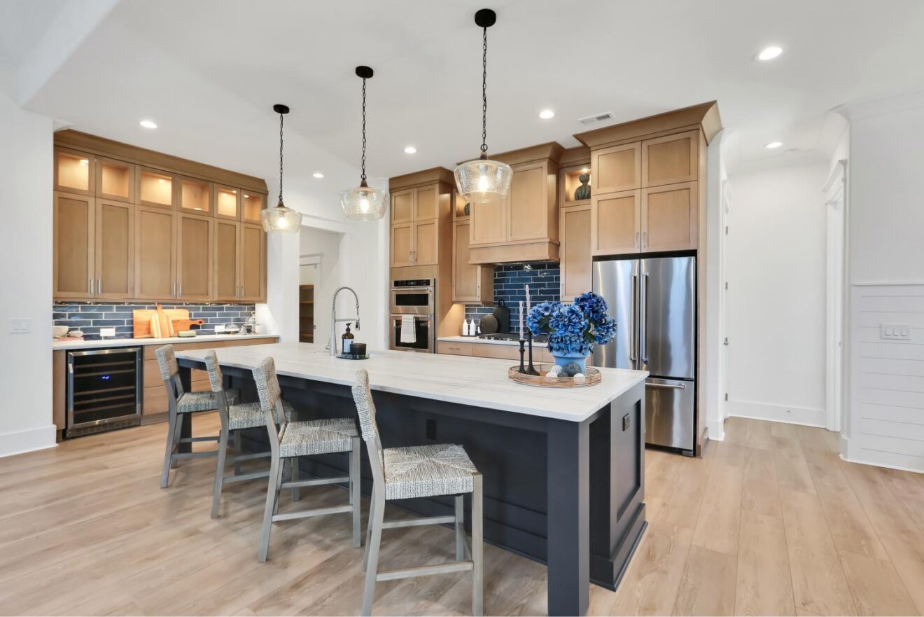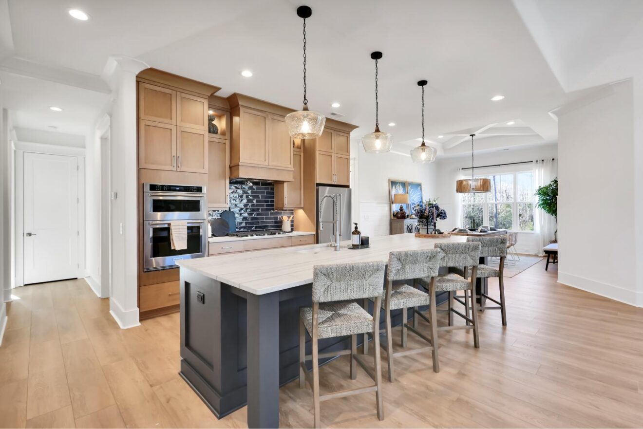 - Chef’s kitchen with oversized island, buffet station, and walk-in pantry