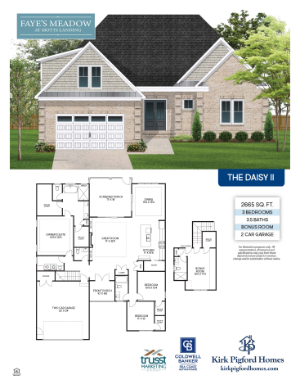 The Daisy floorplan by Kirk Pigford Homes, featured in Faye’s Meadow at Motts Landing, offers a 2,665 sq. ft. layout with three bedrooms, three bathrooms, and a two-car garage. The main level includes an open-concept great room, connecting seamlessly with the dining area and a spacious kitchen equipped with an island and pantry. The primary suite offers a luxurious bathroom and a walk-in closet. Two additional bedrooms on this floor share a nearby bathroom. Outdoor living is enhanced by a screened porch, accessible from the dining area, with an optional sunroom for additional relaxation space. Upstairs, a bonus room provides flexible space for entertainment or a home office. Altogether, our Daisy combines functional living spaces with thoughtful design, perfect for comfortable family living and entertaining.