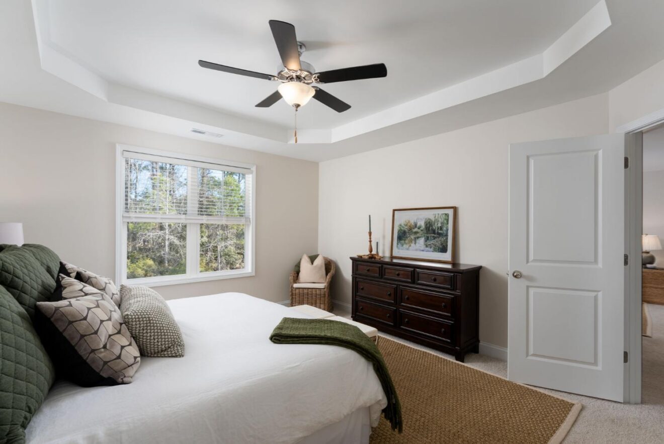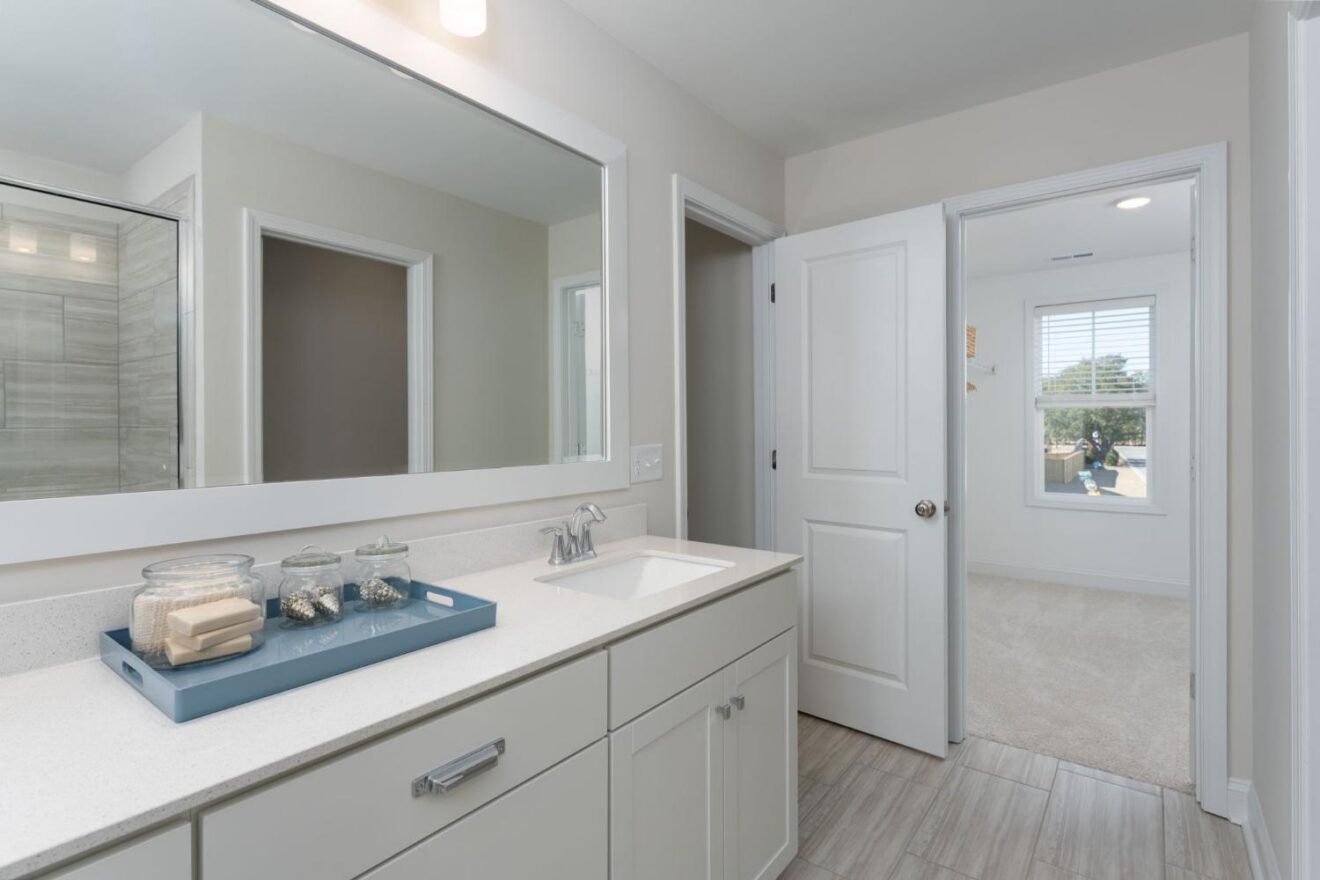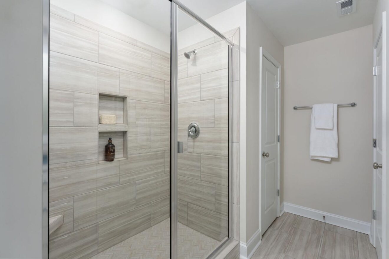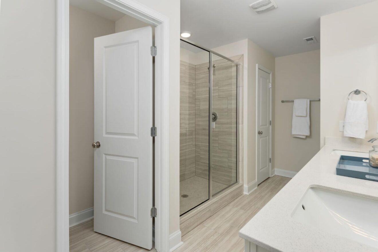 - Primary suite bath features 12×24 tile flooring and an oversized walk-in tile shower.