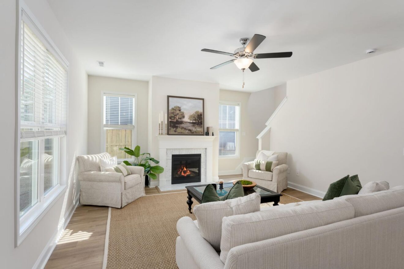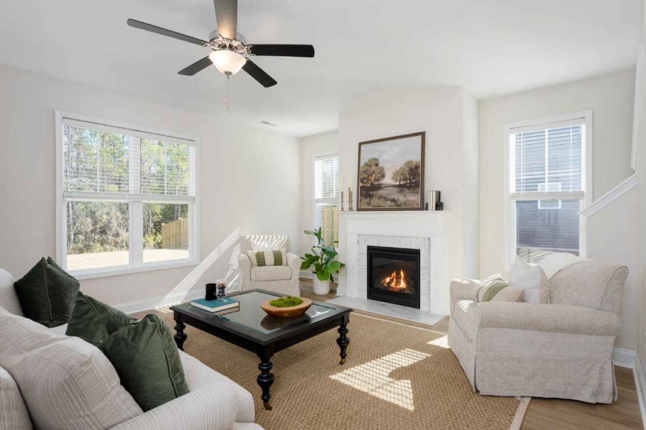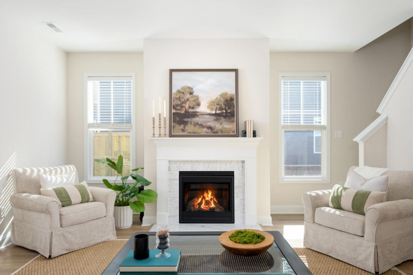 - Inviting fireplace with marble surround anchors the open and airy great room.