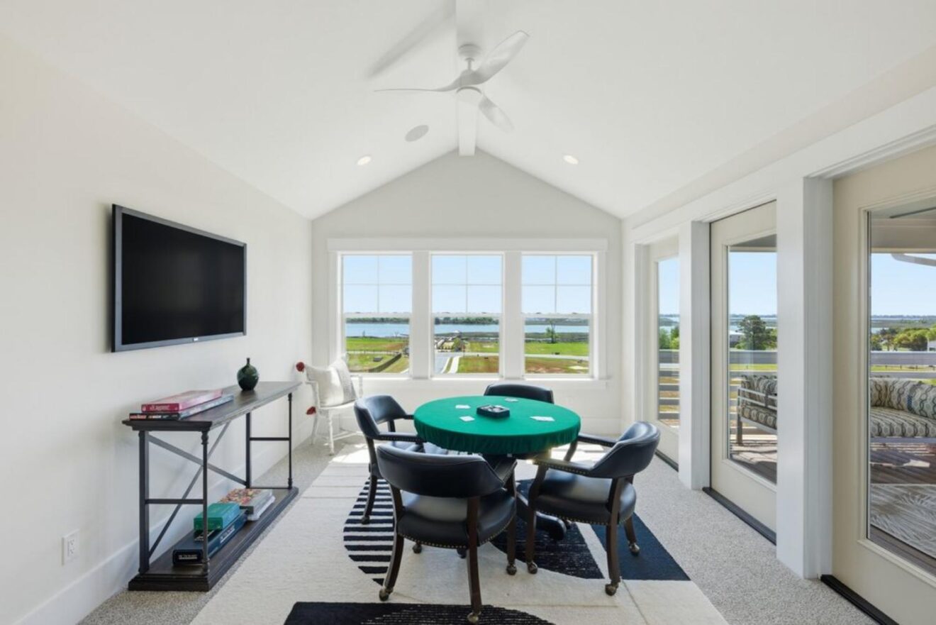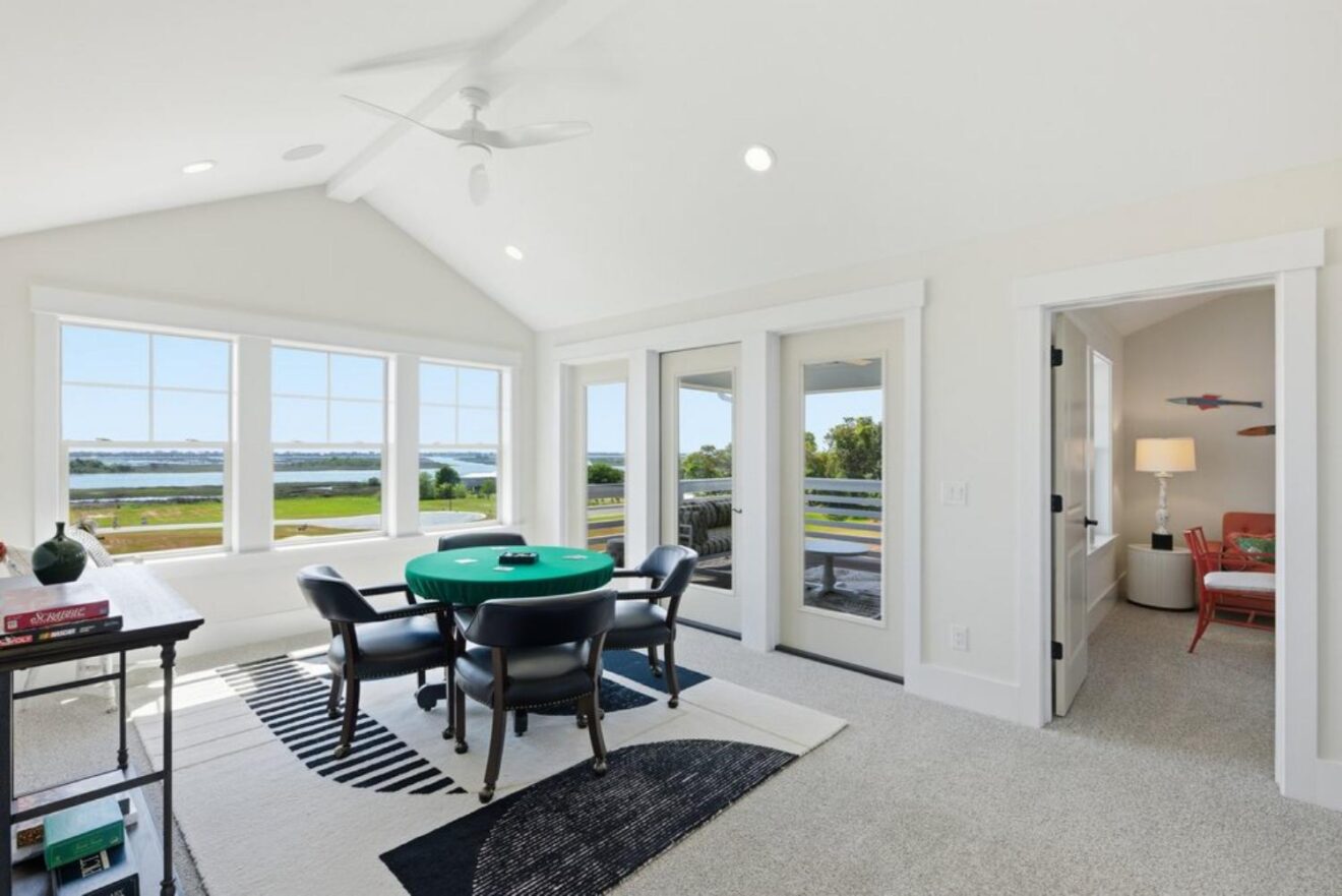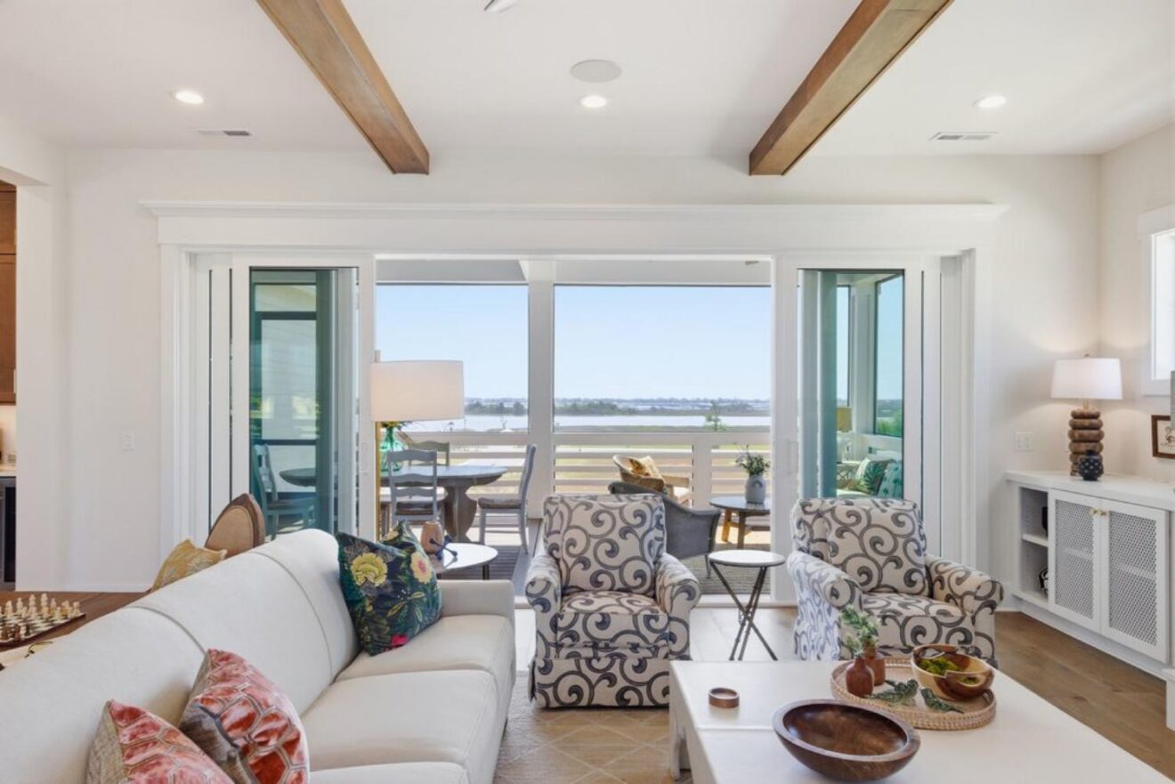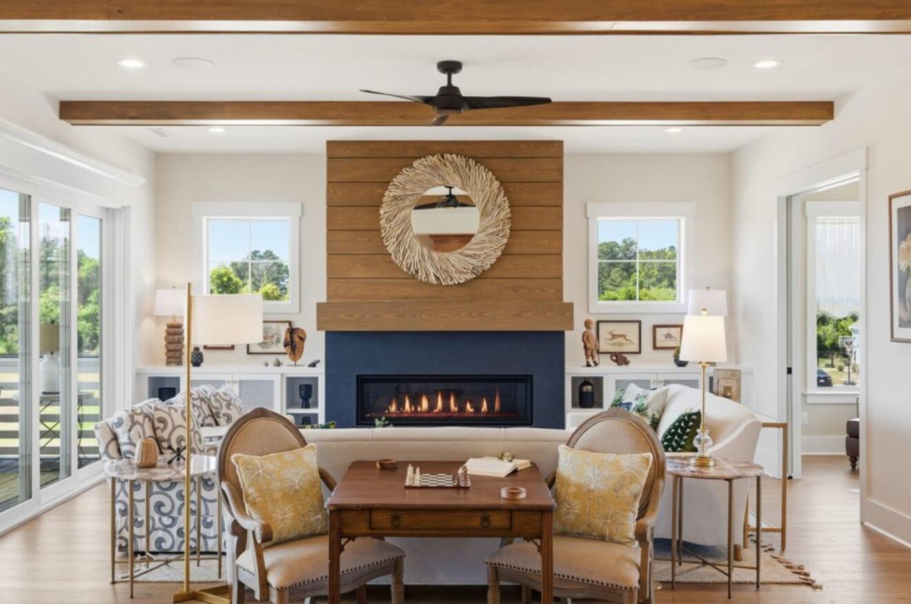 Inside, rich hardwood flooring, a chef’s kitchen with an oversized island, and a grand stone fireplace create an atmosphere of refined comfort. Each bedroom features an en suite bath, including a light-filled primary suite with bay windows, a spacious walk-in closet, and a spa-style zero-entry shower. Designed to embrace coastal living, the home offers multiple outdoor spaces — from a welcoming covered front porch to a second-floor outdoor living room with fireplace and a third-floor covered porch with sweeping views. The Port Royal Sound delivers grandeur without excess, pairing architectural presence with relaxed Carolina charm.