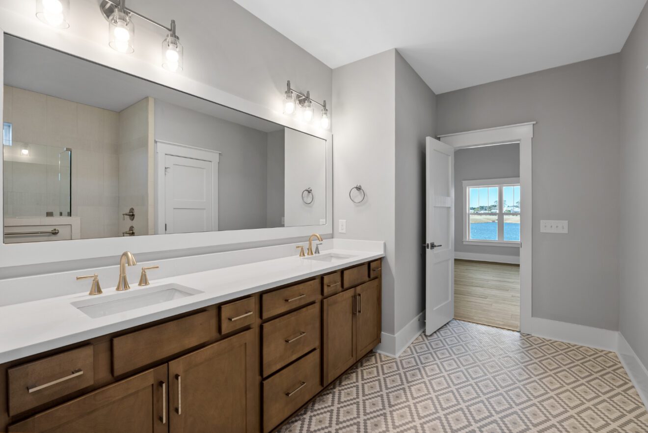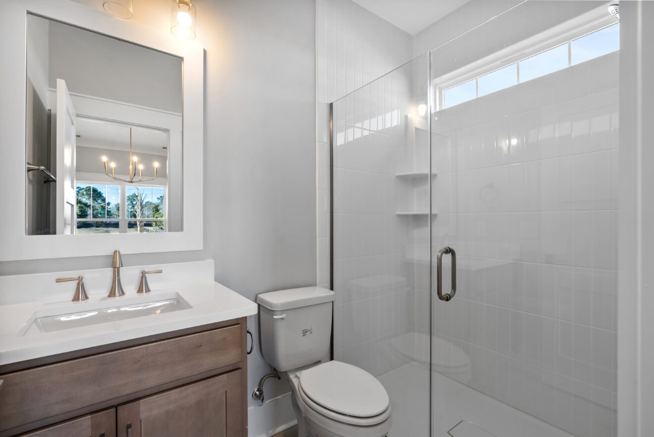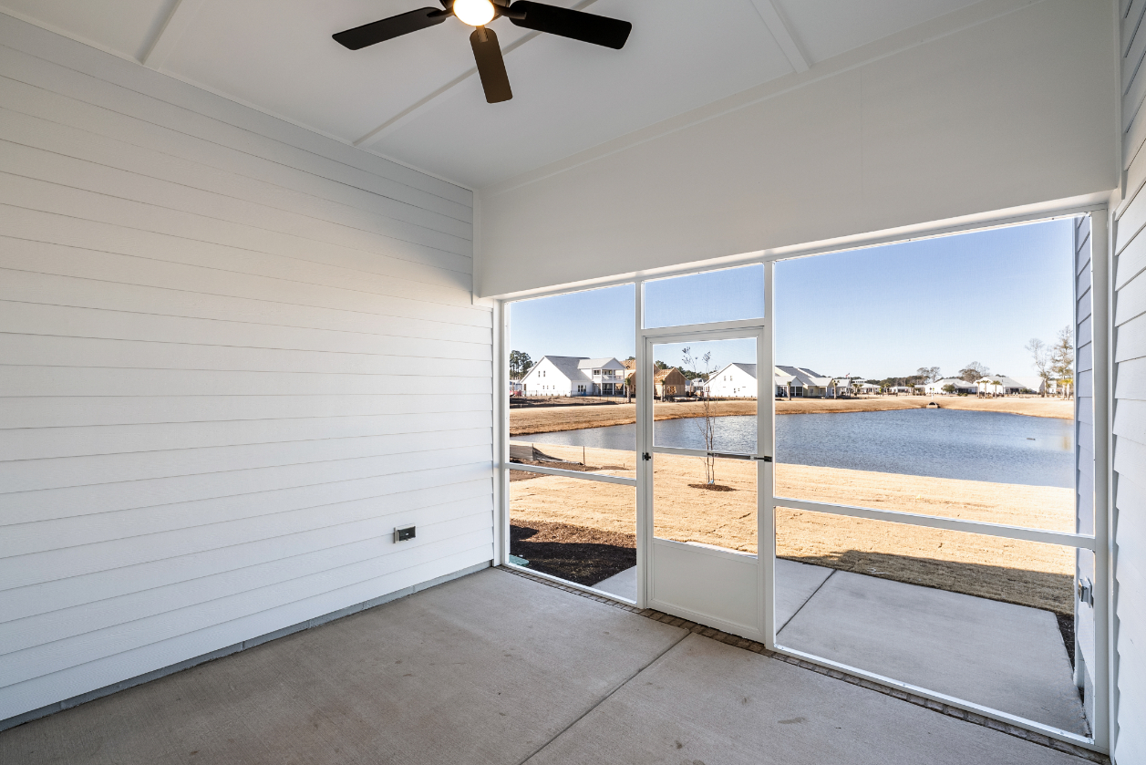 Stunning 11-foot ceilings and custom trim highlight the main living area, creating an open yet refined feel. The prestige kitchen features a gas cooktop and a large walk-in pantry, while the separate dining area offers beautiful windows with peaceful pond views. Enjoy outdoor living year-round on the screened-in porch and adjacent patio. A stylish powder room with shiplap trim and a pedestal sink adds thoughtful character.