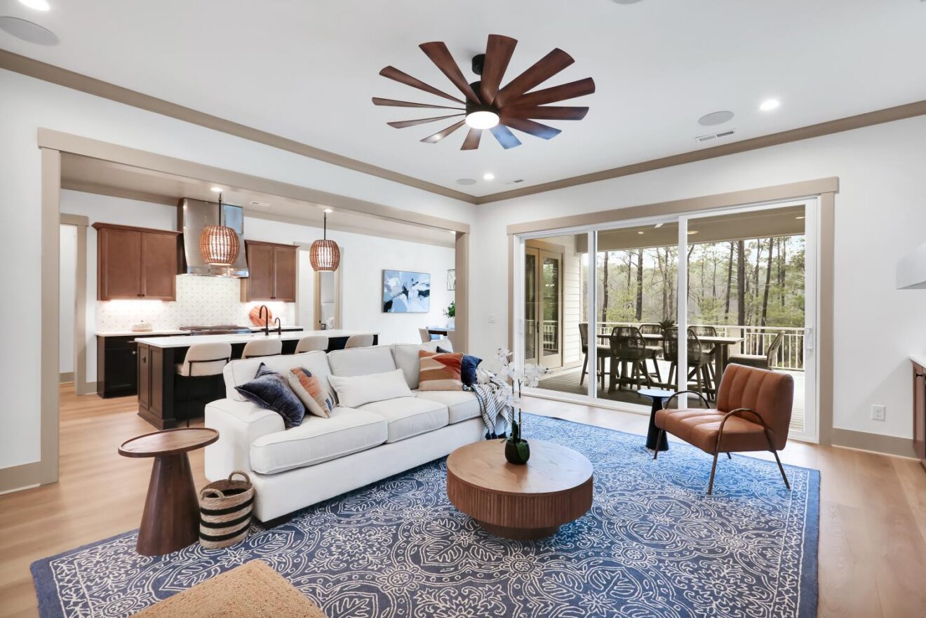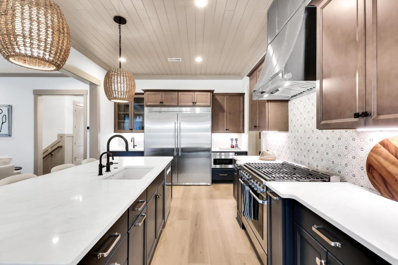 - Open-concept living, dining & kitchen with large center island, bar sink & walk-in pantry