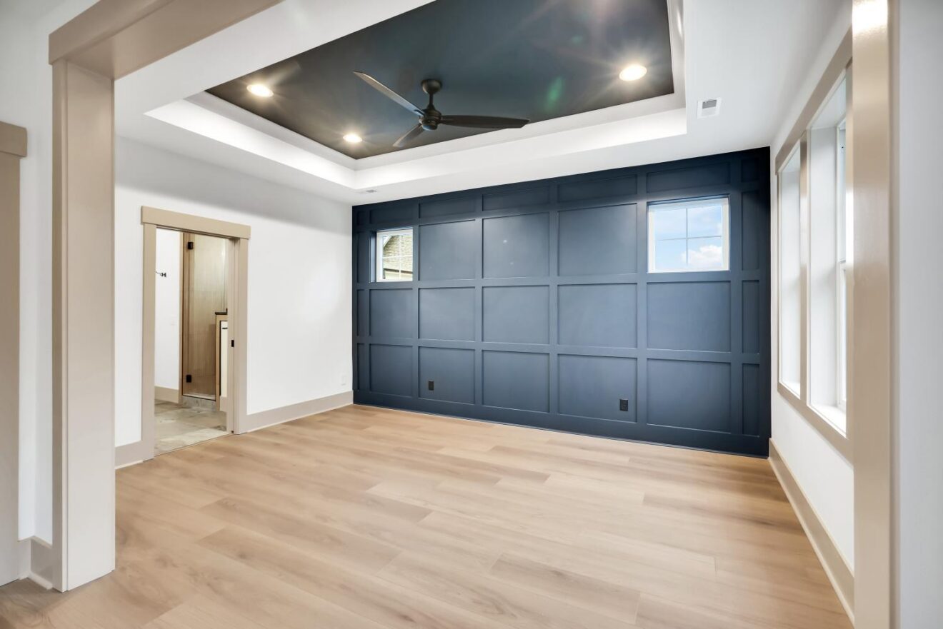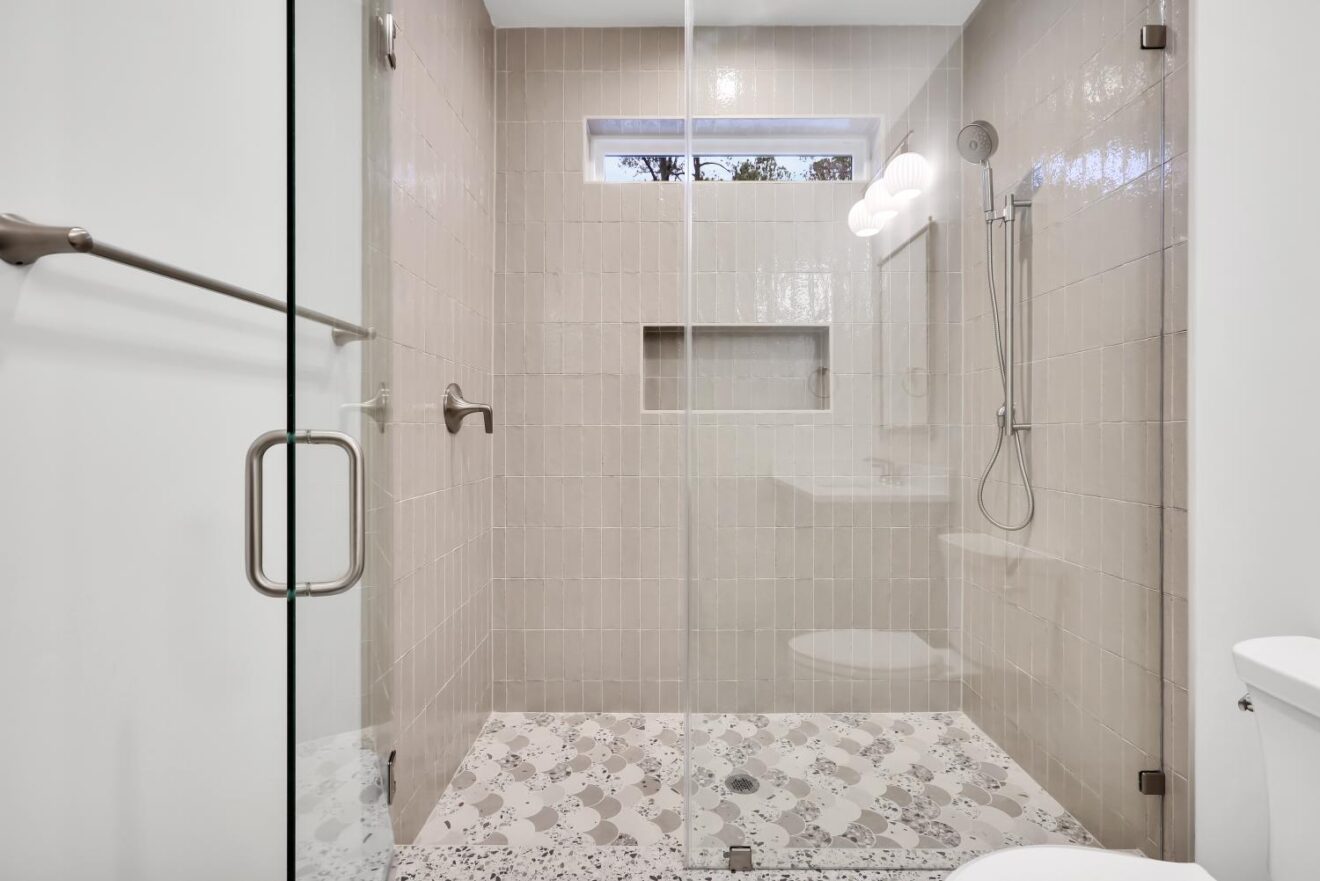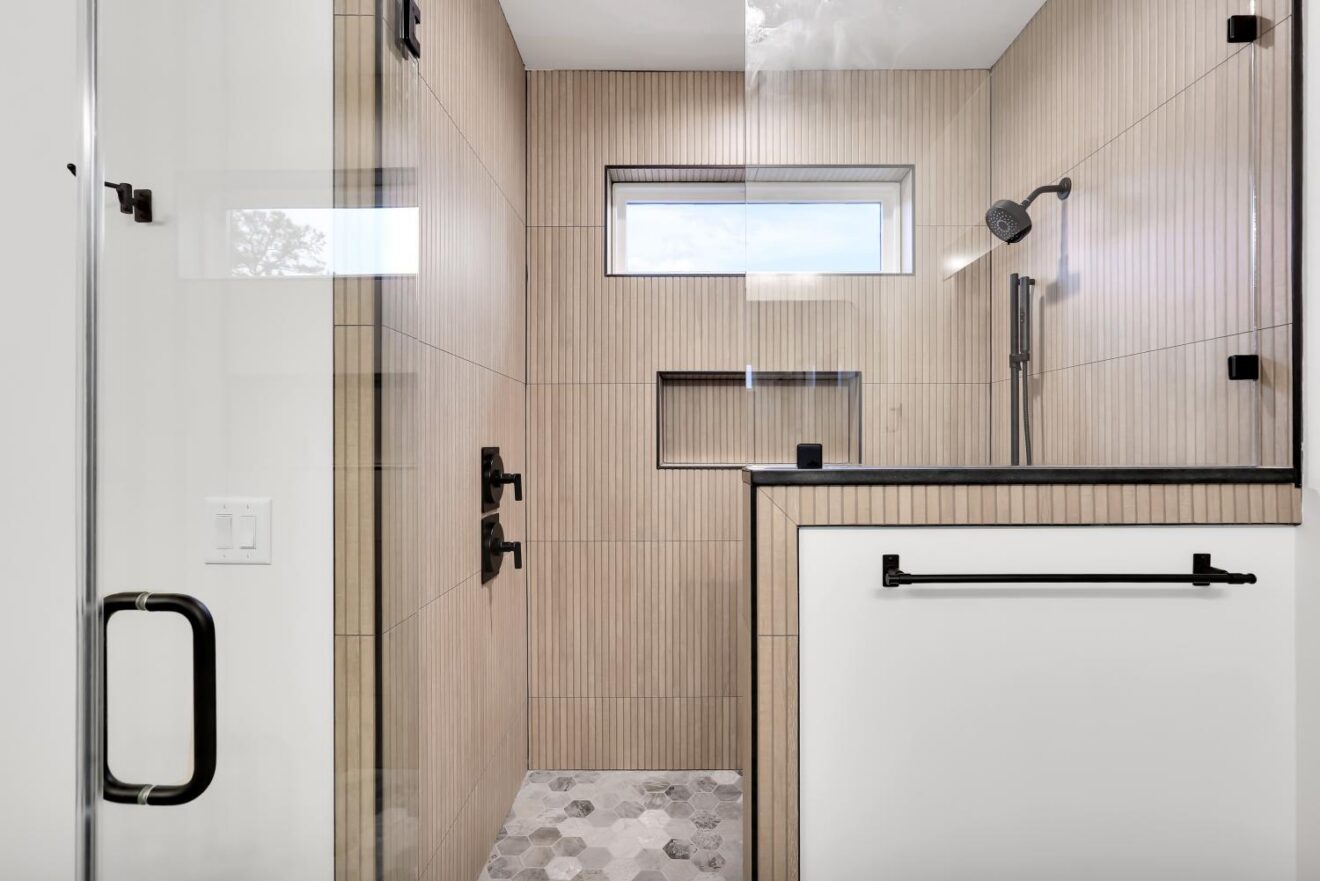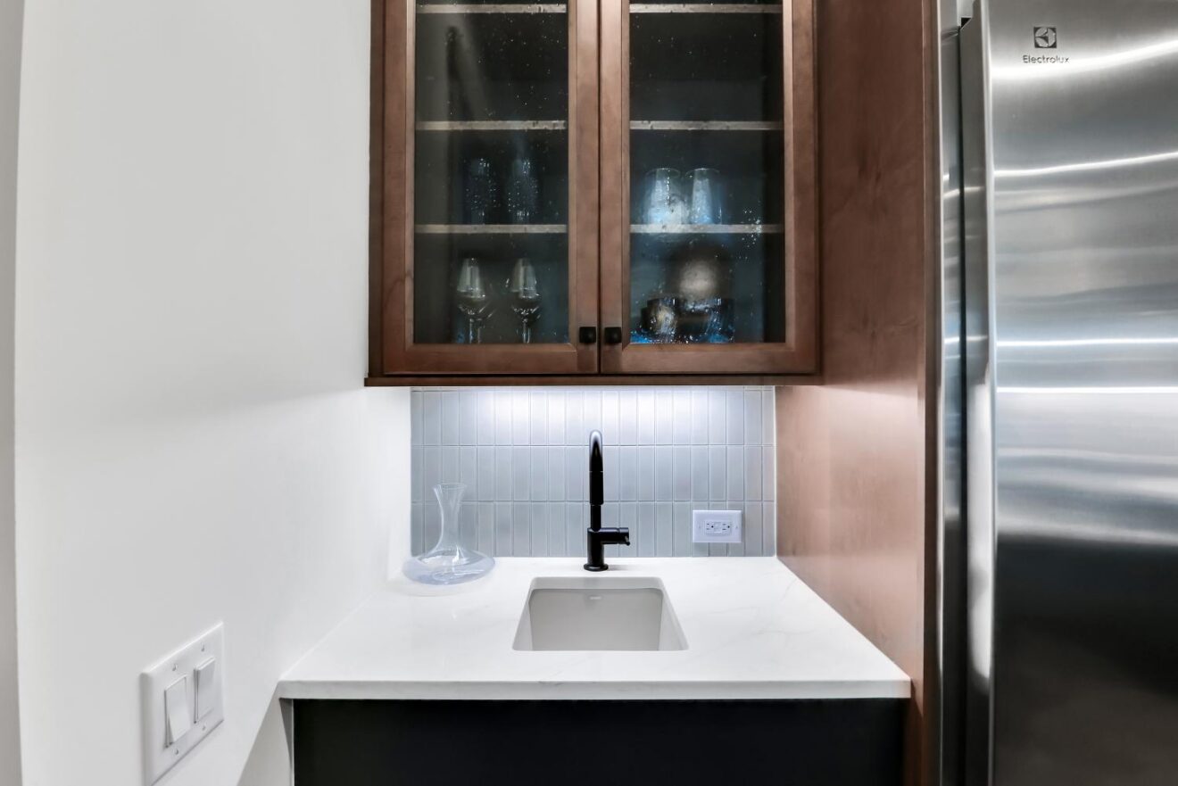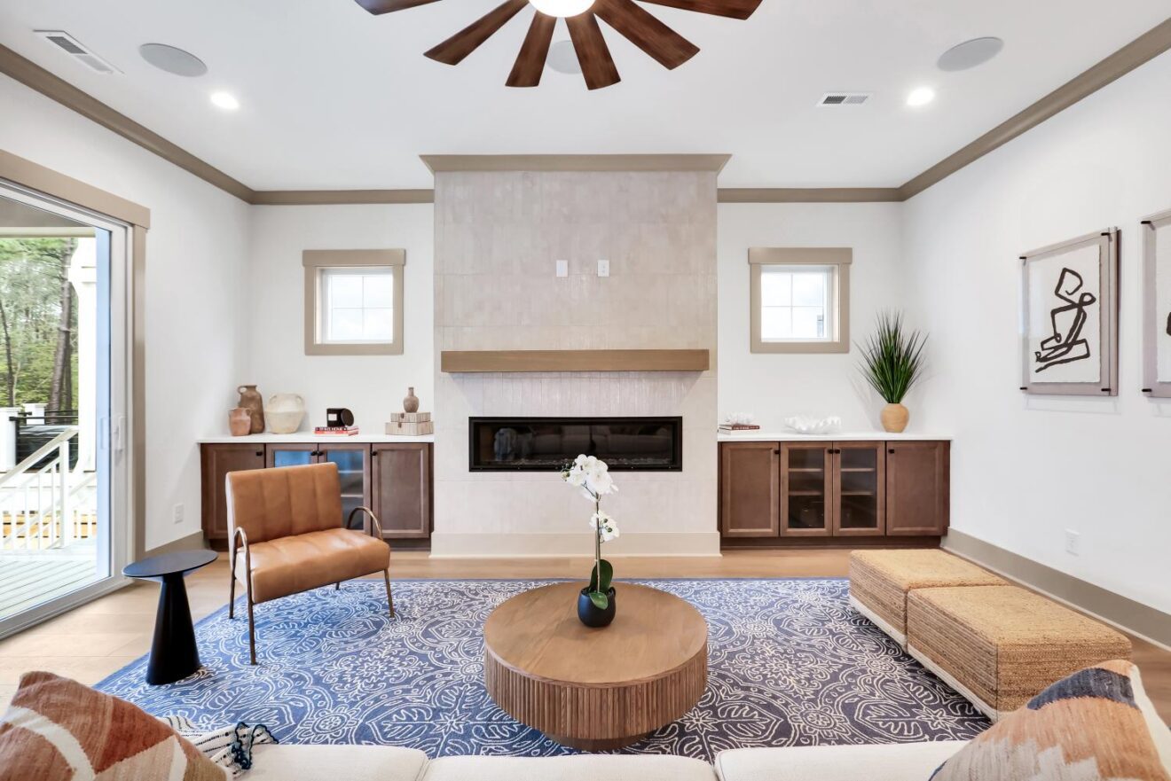 - Living room with 60” linear gas fireplace, custom built-ins & seeded glass doors