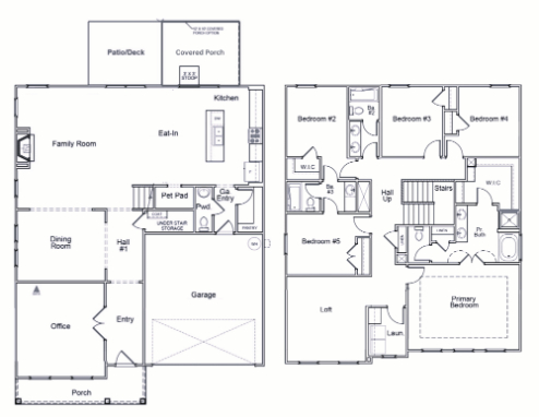 The Turner is a two-story, open-concept home with five bedrooms and three-and-one-half baths. Just off the entry, a home office with beautiful French doors offers a welcoming and functional workspace. The great room connects seamlessly to the formal dining room, kitchen, and eat-in area, creating an easy flow for everyday living and entertaining. The kitchen features quartz countertops, a tile backsplash, a large island, a walk-in pantry, and a convenient half-bath located near the garage entrance. Additional under-stair storage can be found in the entryway closet. Upstairs, the primary bedroom includes a spacious walk-in closet, a linen closet, a garden tub, and a separate shower. Two of the secondary bedrooms share a full bathroom, while the other two are connected by a Jack-and-Jill bathroom. A loft area and the laundry room are also thoughtfully positioned on the second level for added convenience.