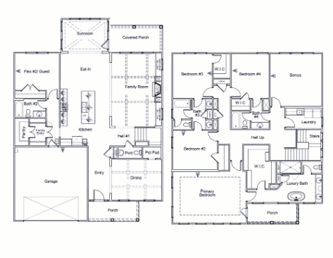 The Webster II is a five-bedroom, four-and-one-half-bath, two-story home. A flex space off the entry can serve as a home office or a formal dining room and features a coffered ceiling for added sophistication. This open plan includes a spacious kitchen with a center island, an eat-in area, and a spacious great room. The great room offers an optional coffered ceiling along with a fireplace flanked by built-ins. A large entry off the garage provides exceptional convenience with an oversized walk-in pantry and a bench with cubbies. A guest bedroom with a full bathroom is located just down the hall on the main level, and a powder bath completes the first floor. Upstairs, two secondary bedrooms with walk-in closets share a Jack-and-Jill bathroom, and a loft offers additional living space. A well-appointed laundry room with a sink adds everyday practicality. The luxurious primary suite features dual closets, a boxed decorative ceiling, and a spa-like bathroom showcasing a separate soaking tub and a large walk-in shower.