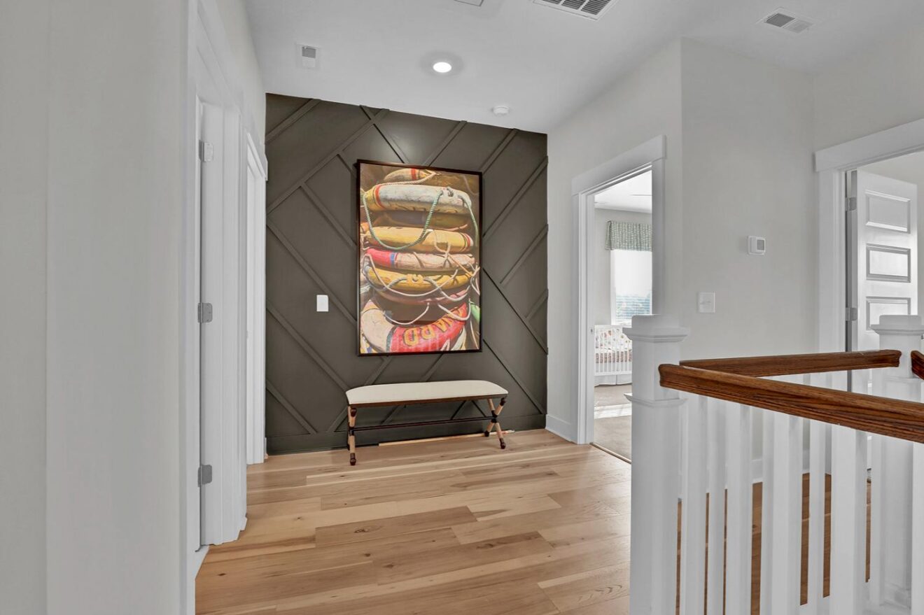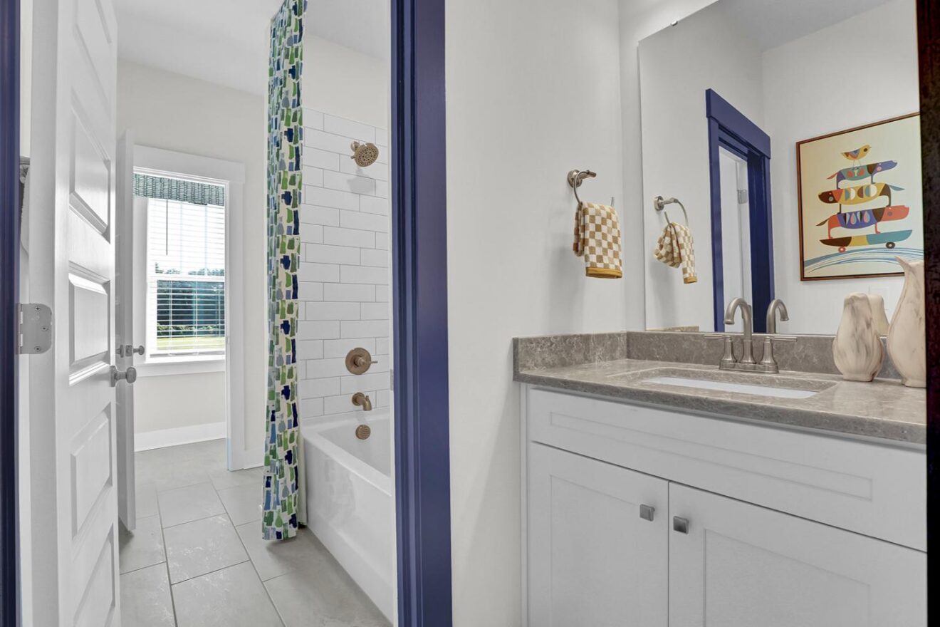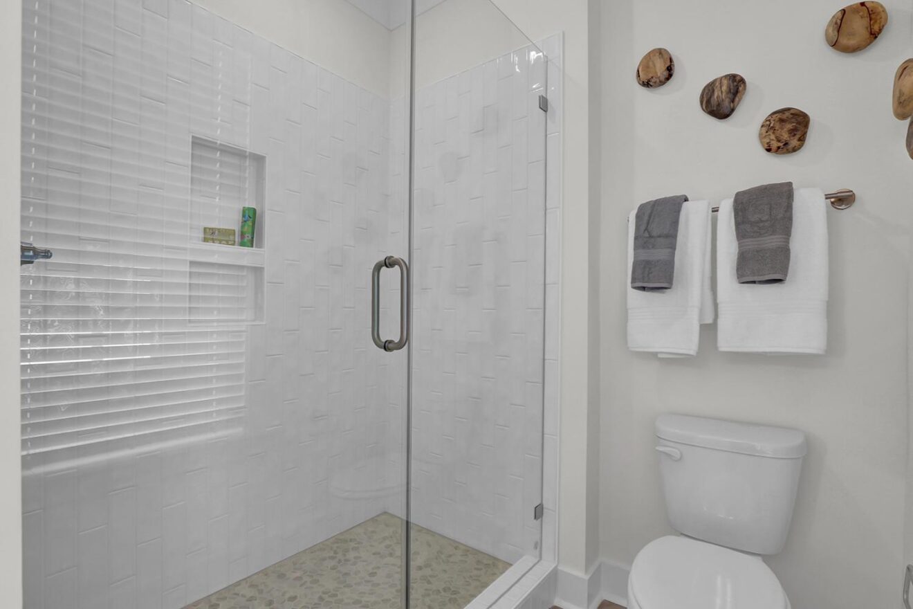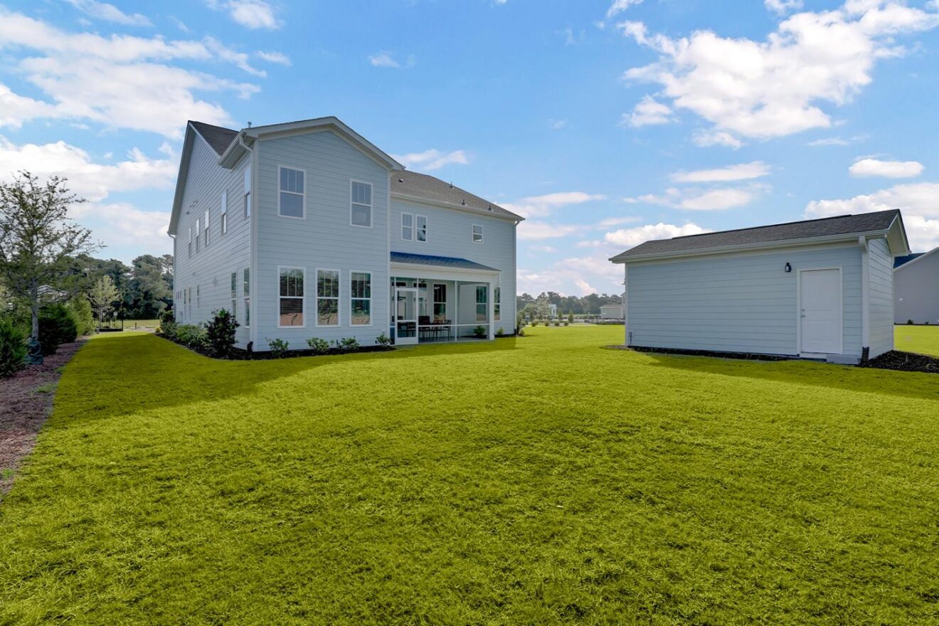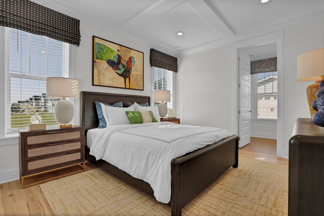 Welcome to the Yates II, a stunning two-story model home in the gated, waterfront community of East Wynd. Thoughtfully designed to impress at every turn, this five-bedroom, four-and-one-half-bath home effortlessly blends timeless elegance with modern, everyday livability, making it a true standout. From the moment you enter, a first-floor flex space with beautiful, coffered ceilings set the tone, ideal for a home office, library, or formal sitting room. The adjacent formal dining room also features coffered detailing and connects seamlessly to the heart of the home through a beautifully appointed butler’s pantry with generous storage. The kitchen and great room come together in an open, light-filled layout designed for gathering, featuring GE Café appliances, decorative ceilings, and a natural gas fireplace with built-in storage. The space flows effortlessly into the sunroom and enlarged covered porch, perfect for relaxed indoor-outdoor living. The first floor offers exceptional versatility with a secondary primary suite featuring decorative ceilings, a walk-in closet, and a thoughtfully designed full bath with a tiled shower and dual vanities. A powder bath and charming pet pad on the first floor living area add thoughtful everyday convenience. Upstairs, the luxurious primary suite serves as a true retreat with a sitting room, vestibule, walk-in closet, a luxury bath, and direct access to the laundry room. Three additional bedrooms include walk-in closets, with two sharing a Jack-and-Jill bath with separate vanities. One of the secondary bedrooms opens to a private second-floor balcony, while a loft area and spacious laundry room complete the upper level. With nine-foot ceilings on both floors and a detached garage, the Yates II is a refined and functional home designed for elevated everyday living.