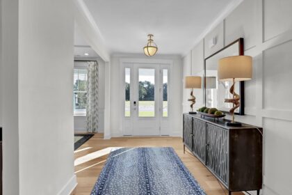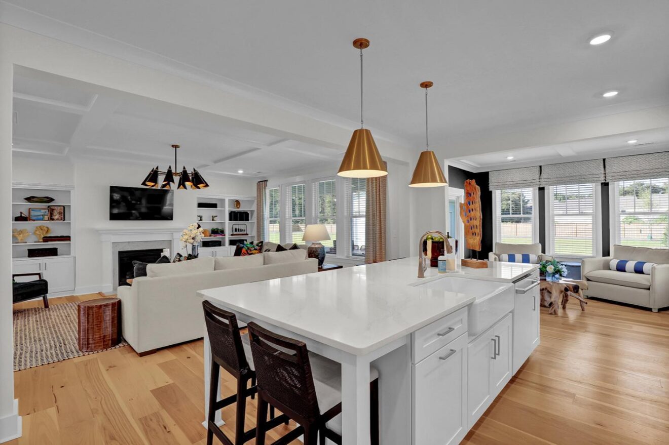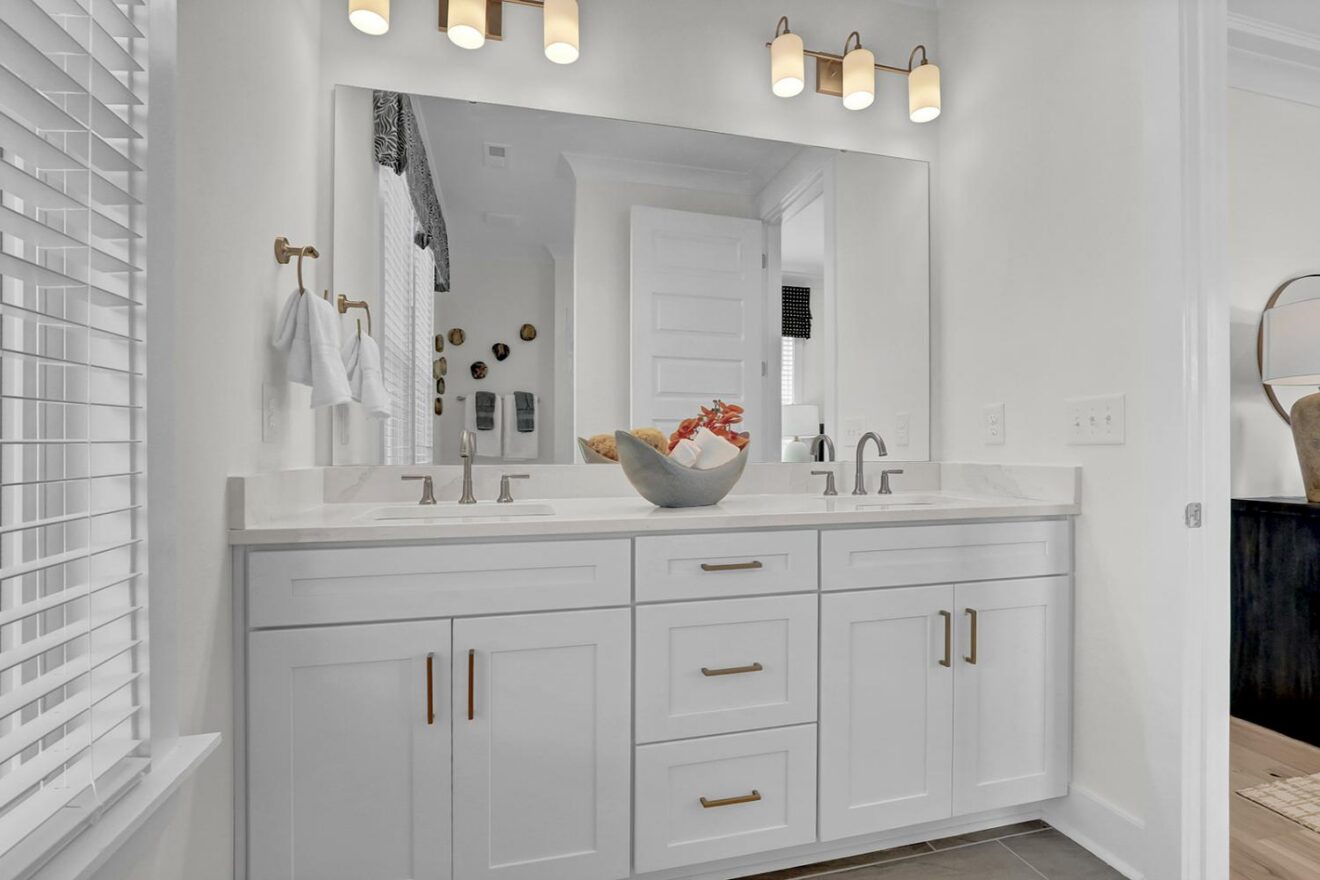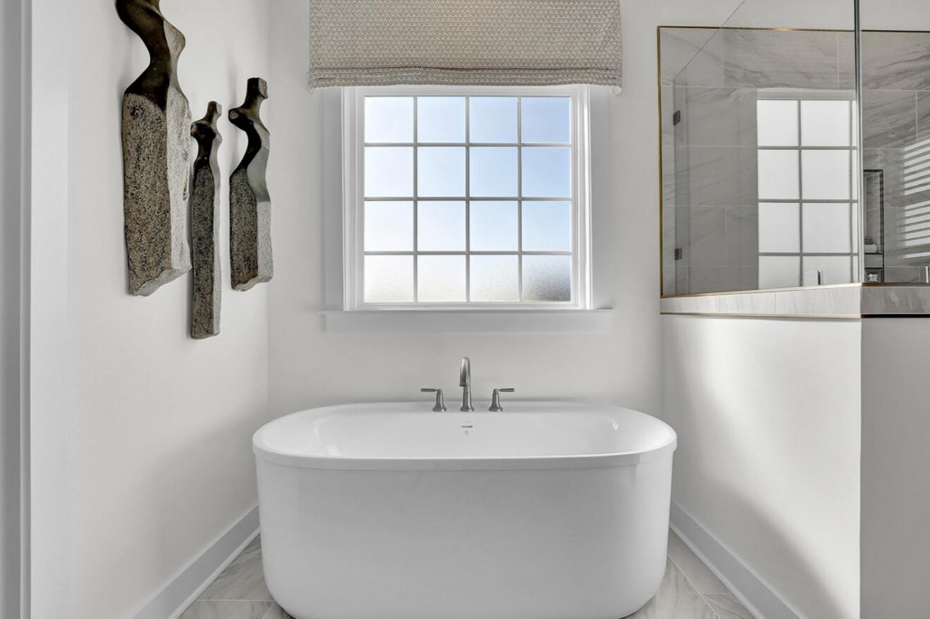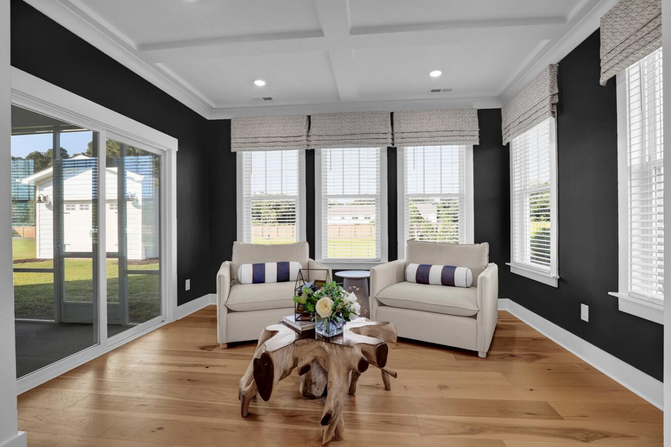 Welcome to the Yates II, a stunning two-story model home in the gated, waterfront community of East Wynd. Thoughtfully designed to impress at every turn, this five-bedroom, four-and-one-half-bath home effortlessly blends timeless elegance with modern, everyday livability, making it a true standout. From the moment you enter, a first-floor flex space with beautiful, coffered ceilings set the tone, ideal for a home office, library, or formal sitting room. The adjacent formal dining room also features coffered detailing and connects seamlessly to the heart of the home through a beautifully appointed butler’s pantry with generous storage. The kitchen and great room come together in an open, light-filled layout designed for gathering, featuring GE Café appliances, decorative ceilings, and a natural gas fireplace with built-in storage. The space flows effortlessly into the sunroom and enlarged covered porch, perfect for relaxed indoor-outdoor living. The first floor offers exceptional versatility with a secondary primary suite featuring decorative ceilings, a walk-in closet, and a thoughtfully designed full bath with a tiled shower and dual vanities. A powder bath and charming pet pad on the first floor living area add thoughtful everyday convenience. Upstairs, the luxurious primary suite serves as a true retreat with a sitting room, vestibule, walk-in closet, a luxury bath, and direct access to the laundry room. Three additional bedrooms include walk-in closets, with two sharing a Jack-and-Jill bath with separate vanities. One of the secondary bedrooms opens to a private second-floor balcony, while a loft area and spacious laundry room complete the upper level. With nine-foot ceilings on both floors and a detached garage, the Yates II is a refined and functional home designed for elevated everyday living.